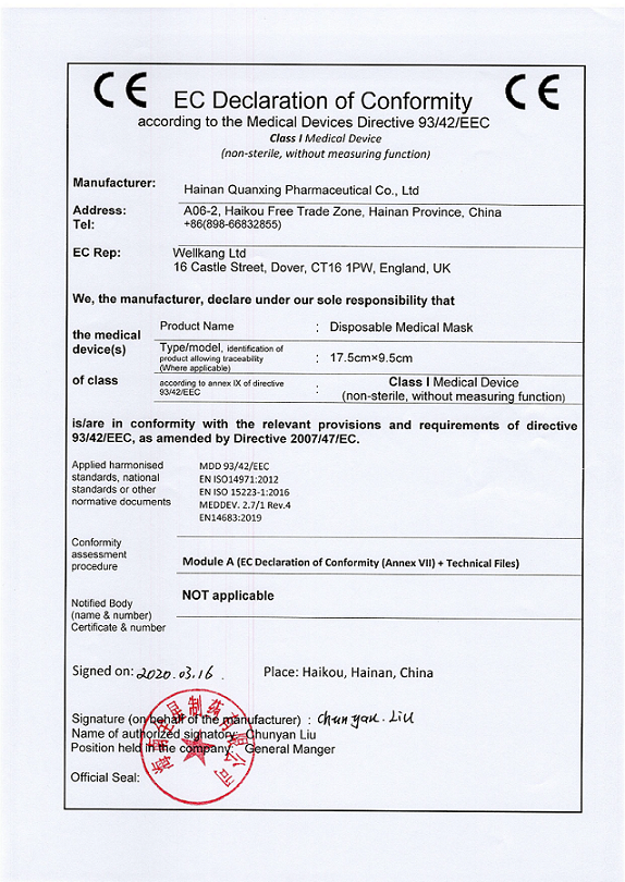 至此我司非無菌醫(yī)用口罩順利通過CE認(rèn)證,成為海南省首家醫(yī)用口罩產(chǎn)品通過歐盟認(rèn)證的企業(yè)。